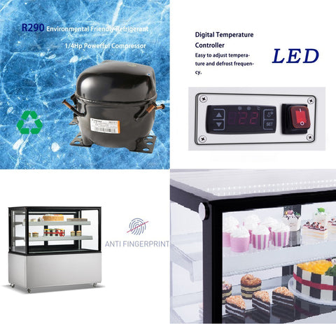 Display your signature cakes, pies, and pastries with ease using this 36" square glass stainless steel refrigerated bakery display case! With its smooth, square glass design, this contemporary case keeps contents sanitary while providing maximum visibility to entice your customers. Plus, this unit uses eco-friendly R290 refrigerant, making it an environmentally-responsible choice for your business.